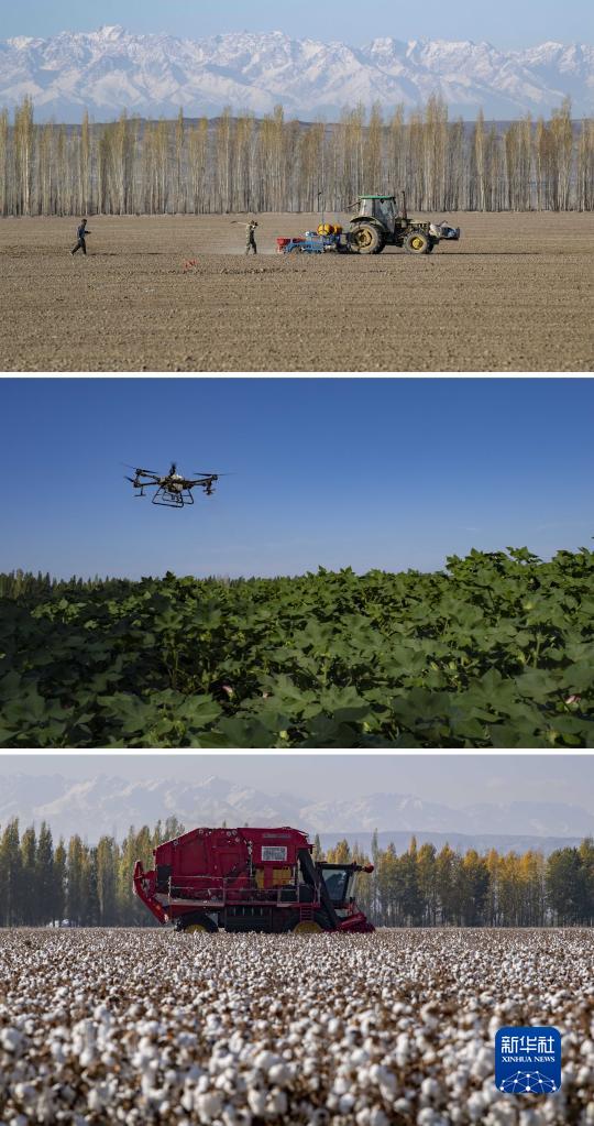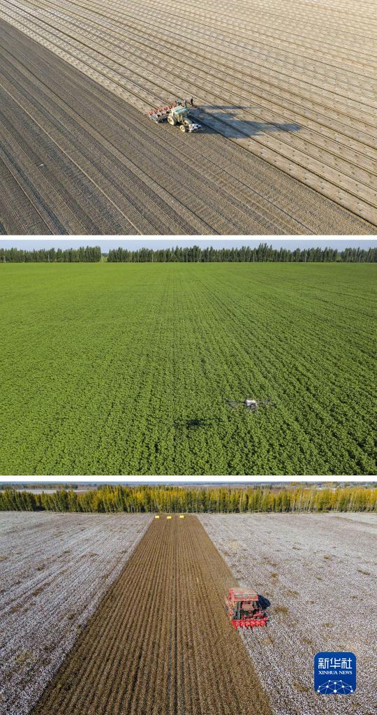 拼版照片:上圖為春播時節(jié),陸高林父子和雇來的工人一起操作機械在棉田里播種(4月15日攝);中圖為夏季田間管理時,農(nóng)業(yè)植保無人機在陸高林家的棉田里打藥(7月15日攝);下圖為秋收時節(jié),陸高林雇來的采棉機在棉田里采收棉花(10月24日攝)。新華社記者 胡虎虎 攝