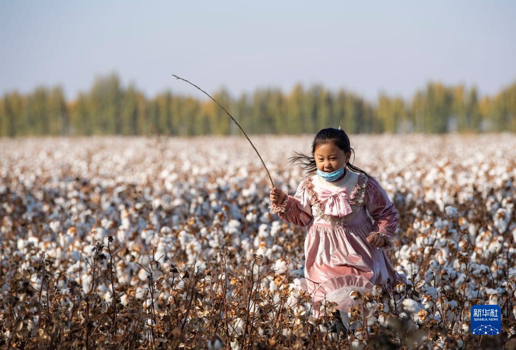 秋收時節(jié),陸高林的大孫女在一片待采收的棉田里奔跑(10月24日攝)。新華社記者 胡虎虎 攝