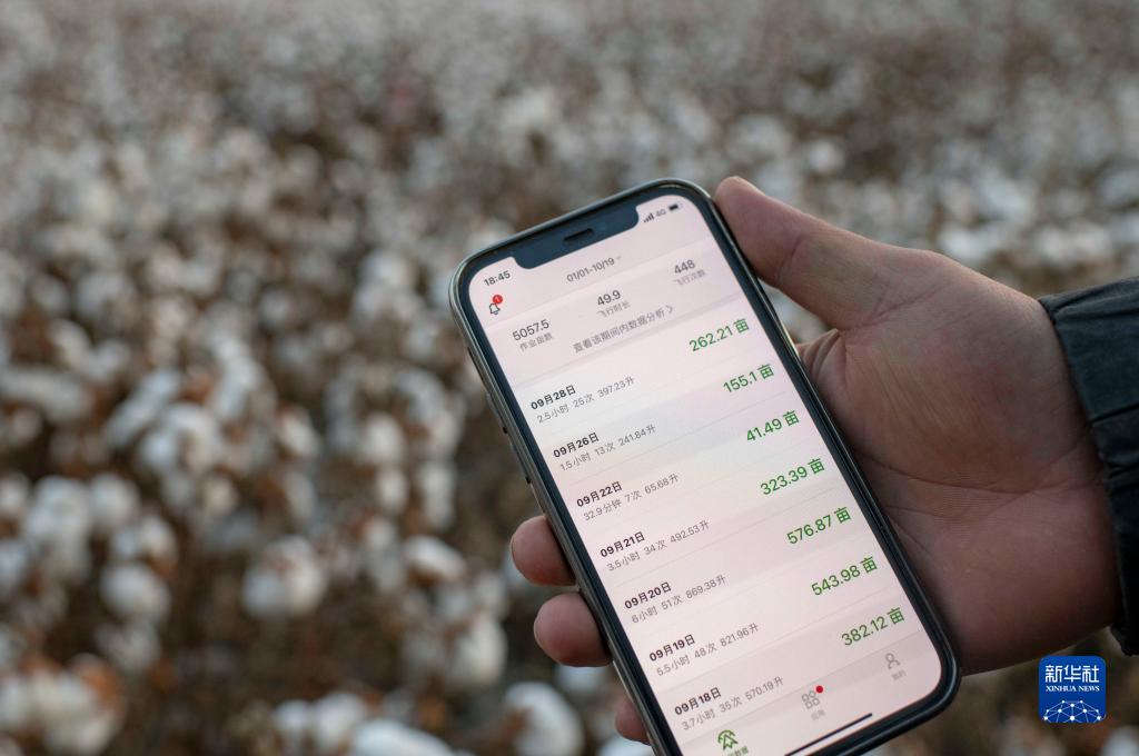 秋收時節(jié),陸德文展示自己使用無人機為自家和其他農(nóng)戶棉田打落葉劑的飛行數(shù)據(jù)(10月19日攝)。在親身感受過無人機飛防作業(yè)的便捷后,老陸家在今年8月買了一臺。新華社記者 胡虎虎 攝