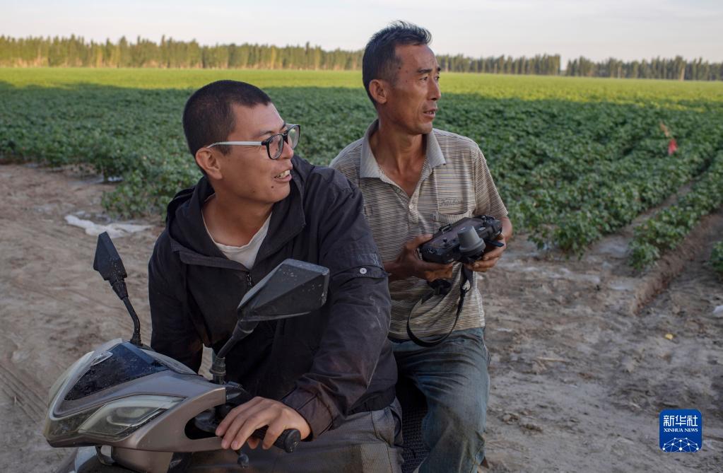 盛夏田間管理期間,陸高林的兒子陸德文(左)騎摩托車帶著農(nóng)業(yè)植保無人機操作手圍著棉地規(guī)劃飛防作業(yè)路線(7月15日攝)。新華社記者 胡虎虎 攝