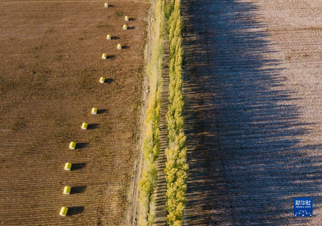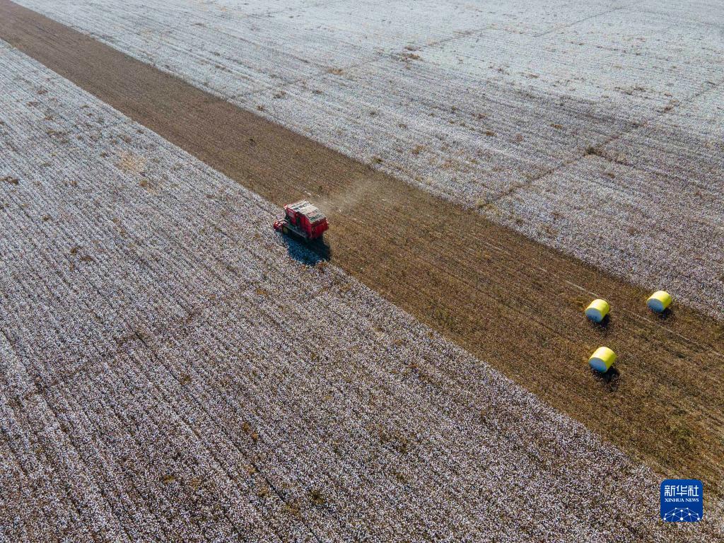 這是在新疆塔城地區(qū)沙灣市大泉鄉(xiāng)三道溝村拍攝的陸高林家的棉田(10月24日攝,無人機照片)。畫面左側為已采收的棉田,棉包擺放在地上,待價格合適時,這些棉包將被運往軋花廠售賣;右側為待采收的地塊。新華社記者 胡虎虎 攝