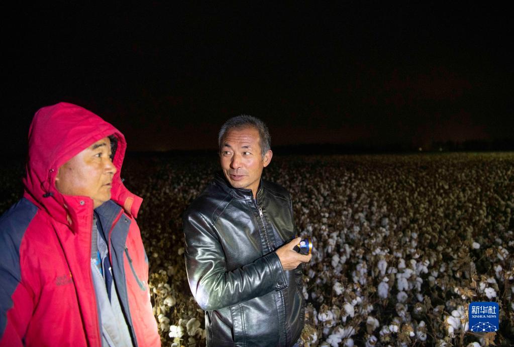 在新疆塔城地區(qū)沙灣市大泉鄉(xiāng)三道溝村,夜幕降臨后,陸高林(右)在等待采棉機轉場,并與采棉機老板商量棉花采收進展(10月22日攝)。新華社記者 胡虎虎 攝