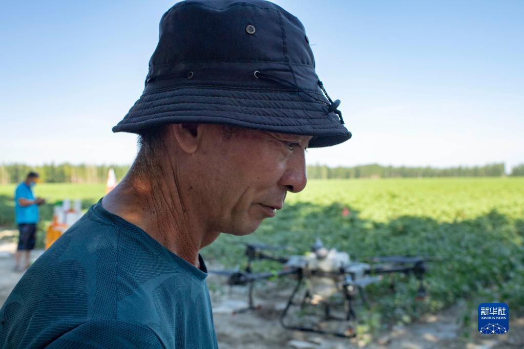 盛夏田間管理期間,雇人使用植保無人機后,陸高林不用再像往常一樣駕駛拖拉機進棉田打藥,農(nóng)活變得更為輕松高效(7月15日攝)。新華社記者 胡虎虎 攝