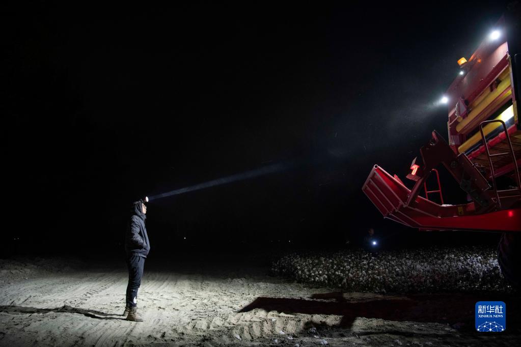 夜幕降臨,陸德文在棉田里守候采棉機轉場(10月22日攝)。新華社記者 胡虎虎 攝