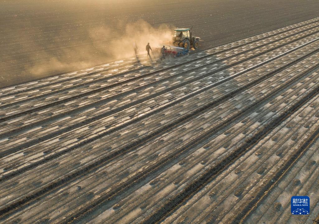 在新疆塔城地區(qū)沙灣市大泉鄉(xiāng)三道溝村,春播時節(jié),陸高林父子和雇來的工人一起操作機械在棉田里播種(4月15日攝,無人機照片)。新華社記者 胡虎虎 攝