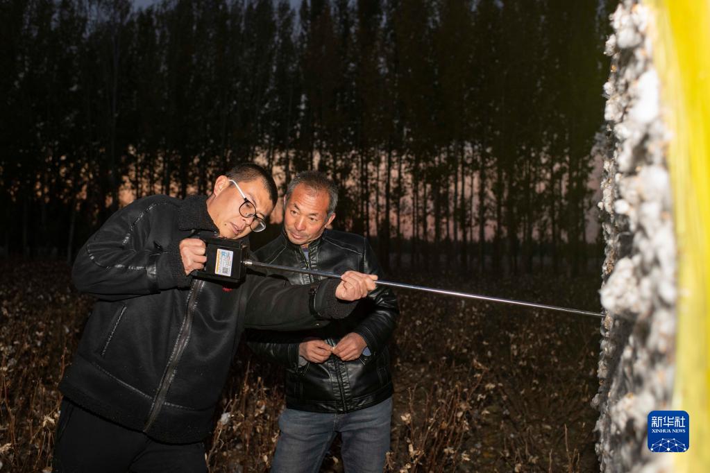 在新疆塔城地區(qū)沙灣市大泉鄉(xiāng)三道溝村,陸高林(右)和兒子陸德文使用儀器檢測已采收棉花的濕度(10月23日攝)。棉花售賣時,軋花廠會對棉包進行質量抽測,濕度過高會影響價格。新華社記者 胡虎虎 攝