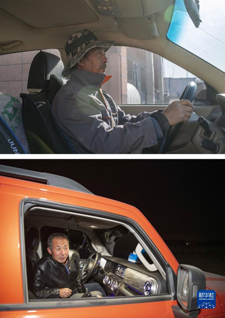 拼版照片:上圖為春播時節(jié),陸高林開車載著農(nóng)資去棉田干活(4月15日攝);下圖為秋收時節(jié),陸高林在新?lián)Q的越野車內(nèi)等候采棉機轉場(10月22日攝)。新華社記者 胡虎虎 攝