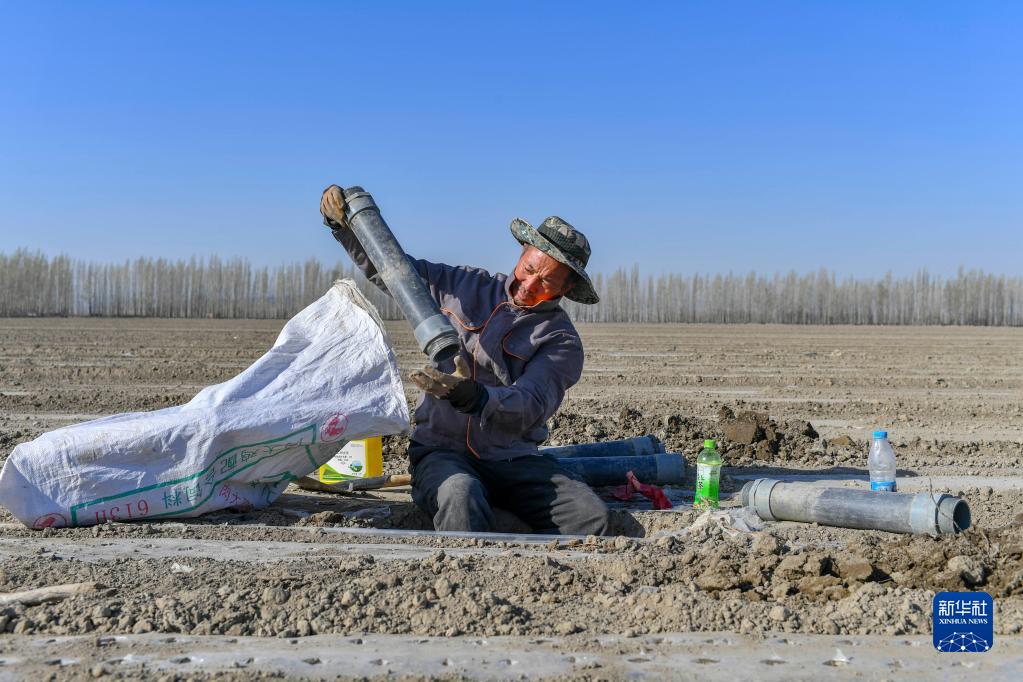 陸高林在一片已播種的棉地里清理滴管管道設備,為出苗時的水肥供給做準備(4月15日攝)。新華社記者 胡虎虎 攝