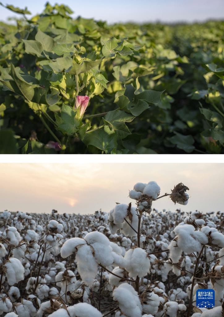 拼版照片:上圖為盛夏時節(jié)在新疆塔城地區(qū)沙灣市大泉鄉(xiāng)三道溝村拍攝的陸高林家的棉田(7月15日攝);下圖為秋收時節(jié)在相同地塊拍攝的陸高林家待采收的棉田(10月19日攝)。新華社記者 胡虎虎 攝