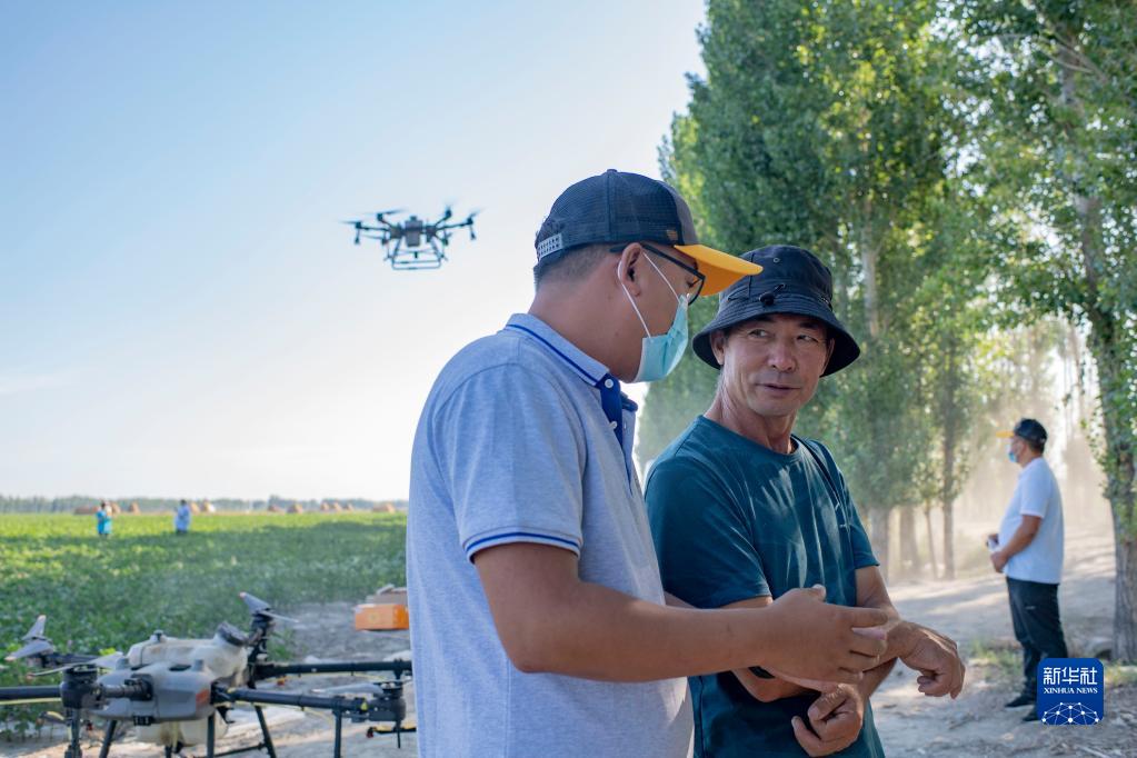 盛夏田間管理期間,陸高林(右)和沙灣市一家農(nóng)業(yè)服務團隊負責人王福珖在棉田里談論農(nóng)業(yè)植保無人機作業(yè)特點(7月15日攝)。新華社記者 胡虎虎 攝