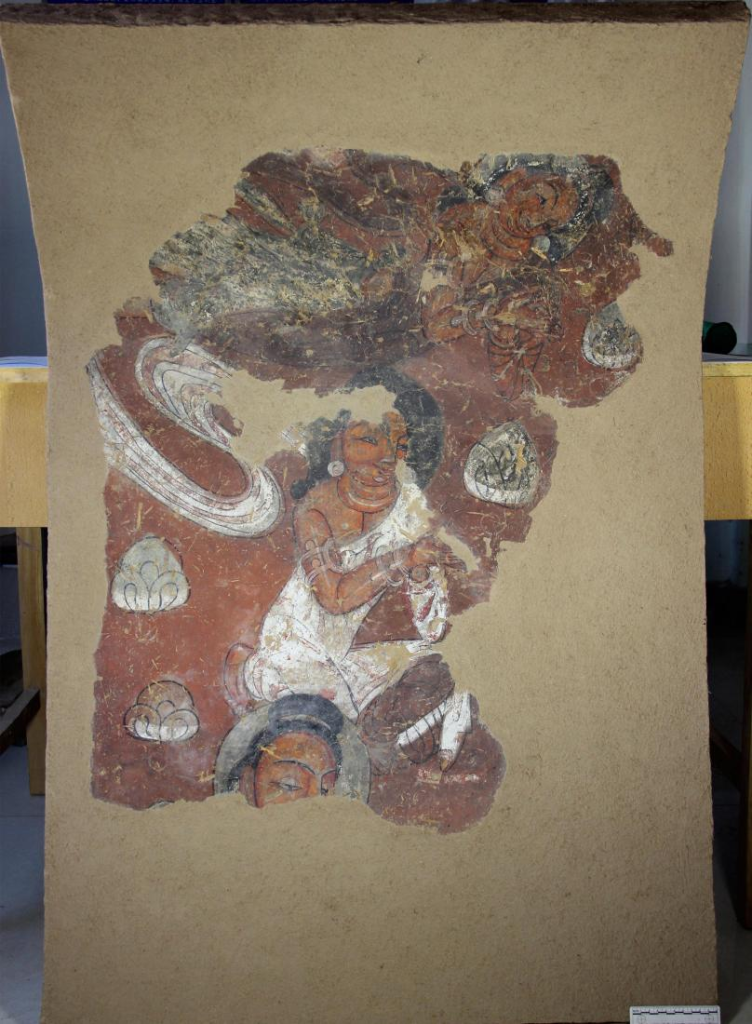 揭取修復的北涼弧形重層壁畫中的飛天部分。