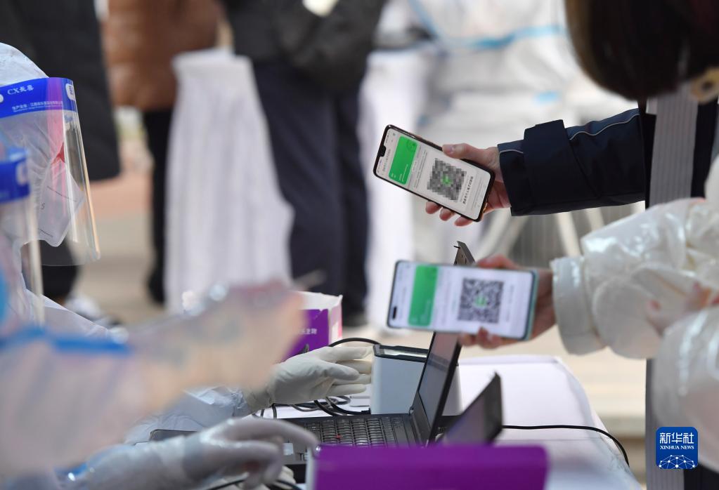 12月23日,在西安一小區(qū),居民掃碼進(jìn)行核酸檢測(cè)。新華社記者 邵瑞 攝