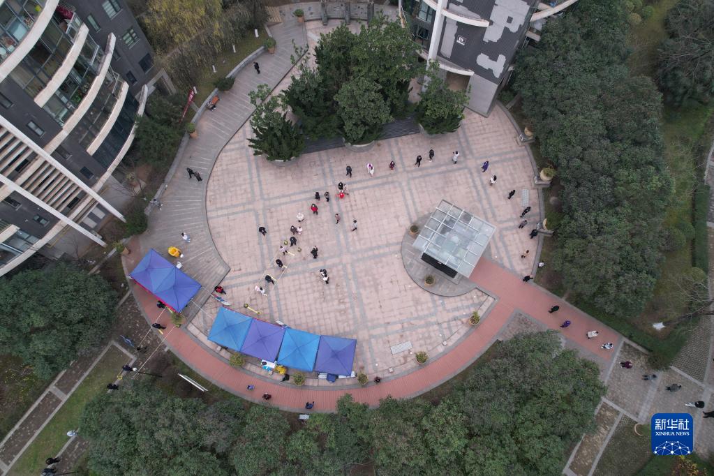 12月23日,在西安一小區(qū),居民排隊(duì)進(jìn)行核酸檢測(cè)(無(wú)人機(jī)照片)。新華社記者 邵瑞 攝