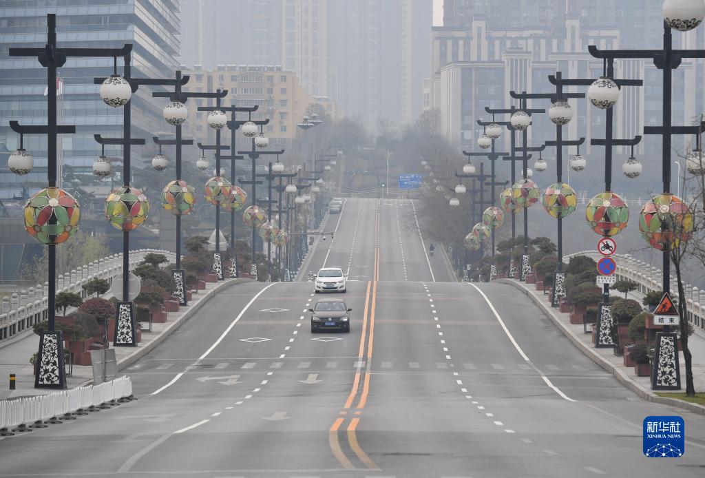 少量車輛行駛在西安市曲江新區(qū)曲江池東路(12月23日攝)。新華社記者 邵瑞 攝