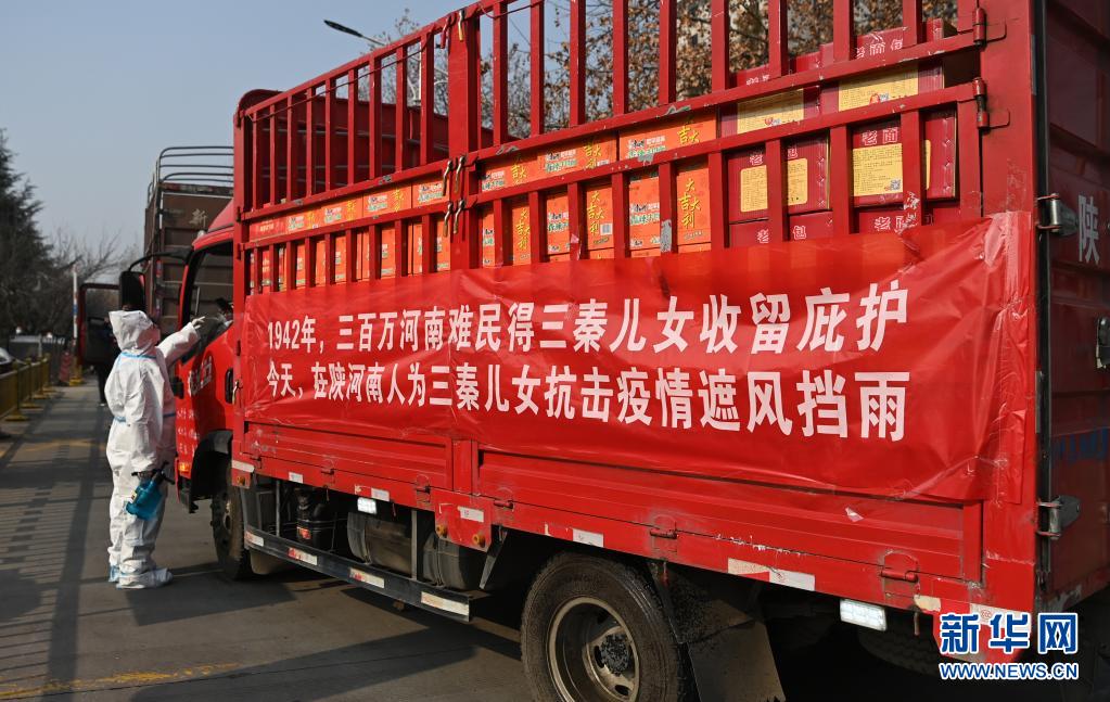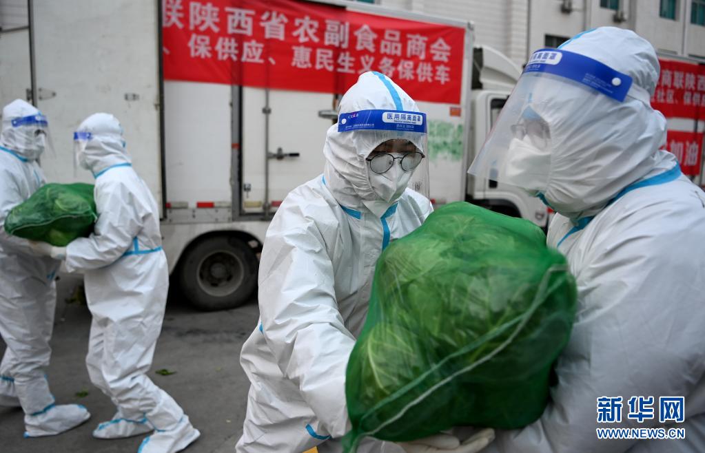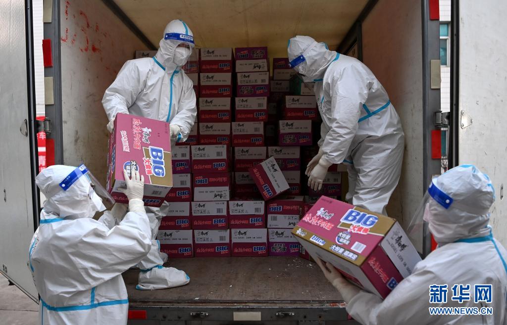 1月2日,西安醫(yī)學(xué)院的學(xué)生志愿者在搬運(yùn)物資。當(dāng)日,陜西省農(nóng)副食品商會向西安醫(yī)學(xué)院捐贈價值40余萬元的愛心蔬菜、食品物資、生活物資。