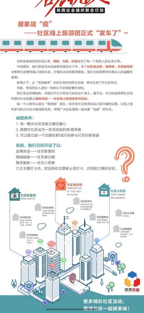 針對(duì)目前疫情防控形式,進(jìn)一步調(diào)動(dòng)激發(fā)社區(qū)內(nèi)生力量動(dòng)員社區(qū)自組織、志愿服務(wù)隊(duì)等團(tuán)體力量,合力抗疫陜西社會(huì)組織聯(lián)合行動(dòng)倡議志愿者在社區(qū)開(kāi)展“家門(mén)口的志愿服務(wù)”社區(qū)實(shí)踐,引導(dǎo)有條件的居民自助互助。