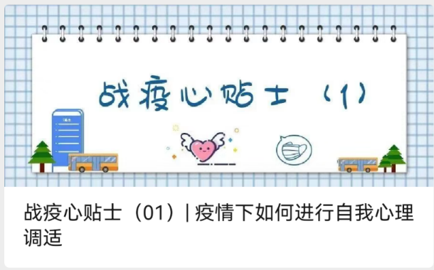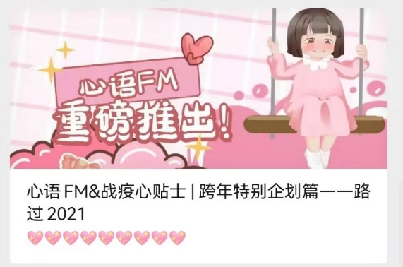 疫情防控期間,考慮到學(xué)生學(xué)習(xí)生活場(chǎng)所受限,學(xué)生情緒容易受到環(huán)境影響。心理健康教育中心通過(guò)新媒體開(kāi)展“戰(zhàn)疫心貼士”、心語(yǔ)FM專(zhuān)欄,每天為該校學(xué)生推送疫情心理調(diào)節(jié)小妙招及各類(lèi)心理援助資源。相繼發(fā)布的15篇推文有效地幫助學(xué)生們掌握了有關(guān)疫情的心理健康知識(shí),學(xué)會(huì)了自我健心減壓,引導(dǎo)他們理性對(duì)待疫情,不恐慌、不信謠、不傳謠,保持良好心理狀態(tài)。