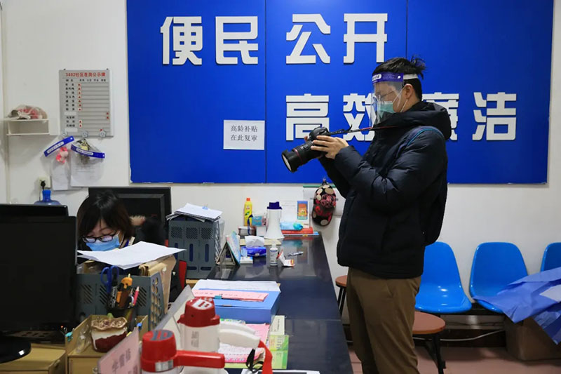 2022年1月2日,三秦都市報記者張宸豪(左)在西安市太華南路街道采訪防疫工作者。