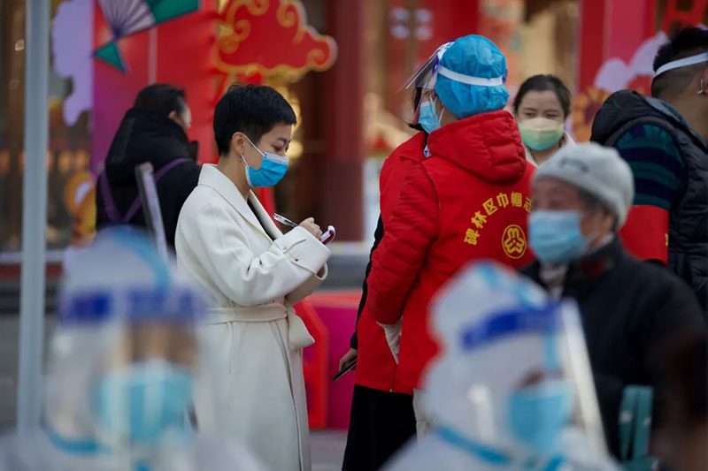 2021年12月23日,咸陽日報社記者李石(左)在全員核酸檢測點采訪。