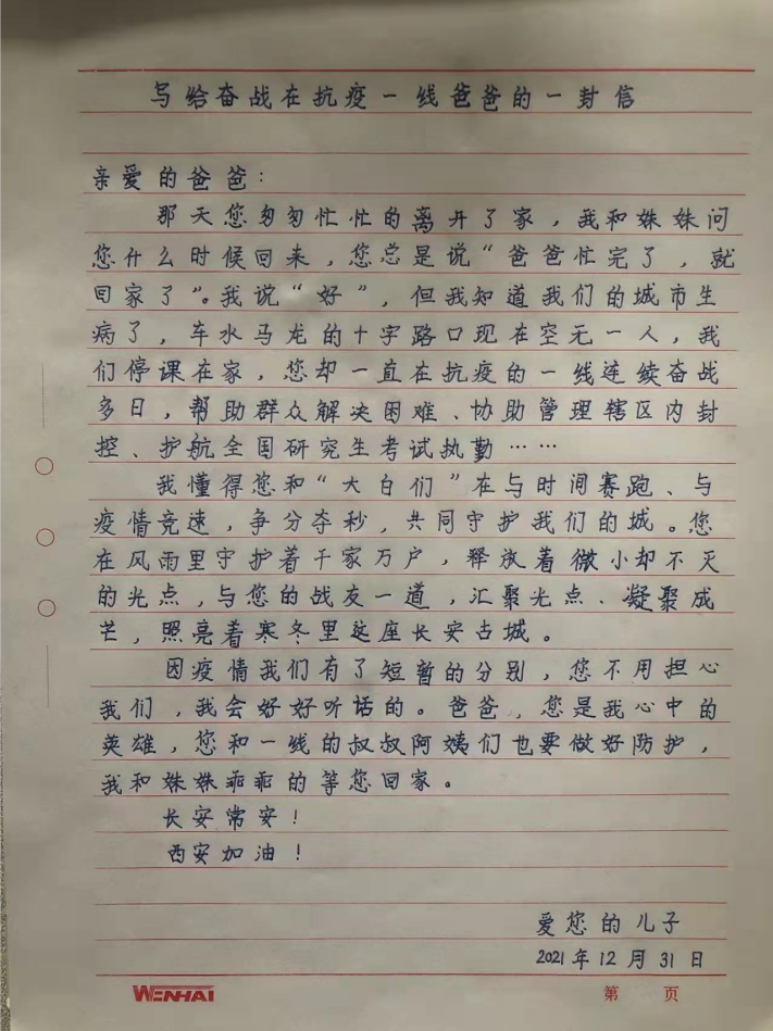 西安體育系統(tǒng)一位抗疫干部收到兒子的親筆信