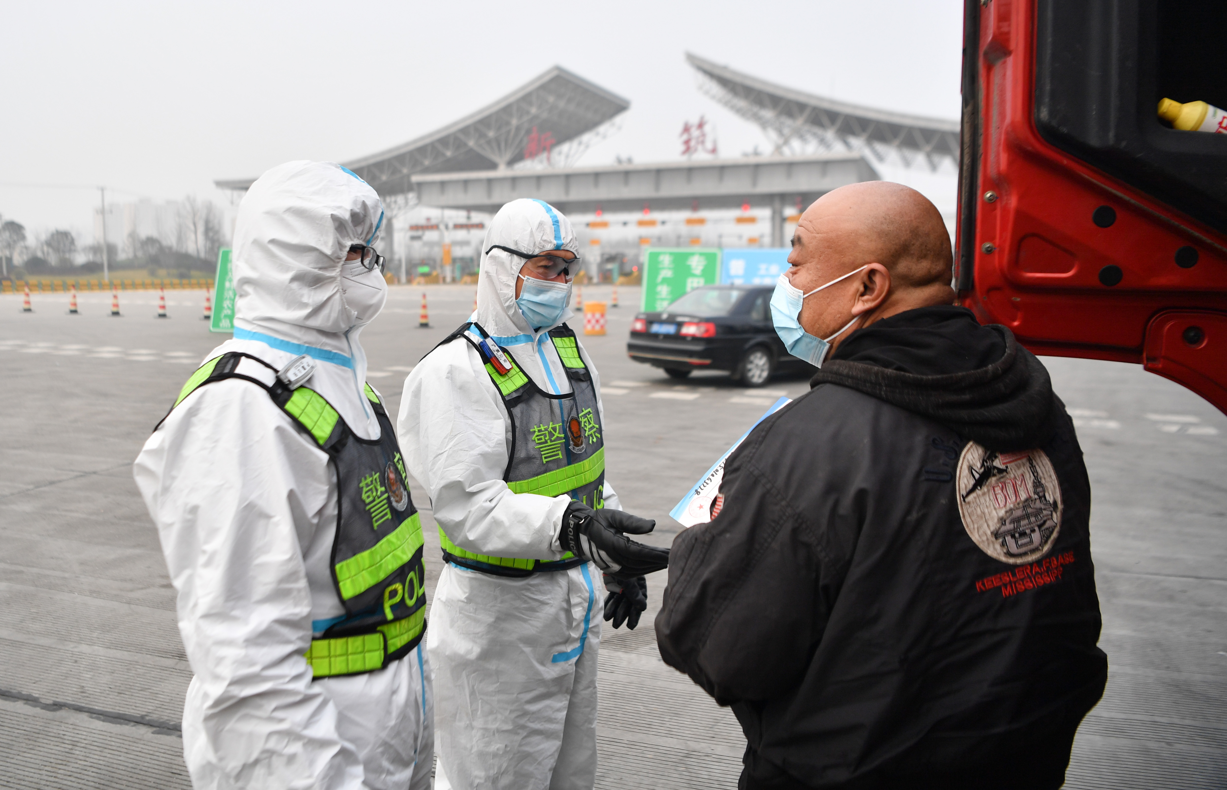 1月10日,西安市公安局浐灞生態(tài)區(qū)分局民警在西安市繞城高速新筑收費(fèi)站查驗(yàn)駕駛員健康碼。新華社記者 張博文 攝