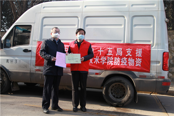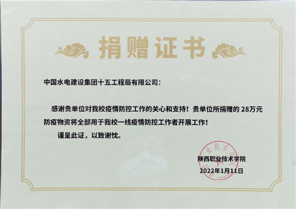 1月11日下午15:00,在陜西職業(yè)技術(shù)學(xué)院舉行簡(jiǎn)短捐贈(zèng)儀式,陜西職業(yè)技術(shù)學(xué)院黨委副書(shū)記、院長(zhǎng)劉勝輝,黨委副書(shū)記、紀(jì)委書(shū)記何軍,副院長(zhǎng)王慶等參加了捐贈(zèng)儀式。劉勝輝代表學(xué)院黨委向我公司表示感謝,他表示,在疫情防控的關(guān)鍵時(shí)刻,水電十五局一周內(nèi)2批次送來(lái)價(jià)值近28萬(wàn)元生活物資,及時(shí)緩解更極大充實(shí)和豐富了我??挂呱钗镔Y,為我院師生樹(shù)立了光輝榜樣,堅(jiān)定了共克時(shí)艱的信心和決心。何軍向公司黨委副書(shū)記、紀(jì)委書(shū)記、工會(huì)主席任志宏贈(zèng)送了捐款證明和感謝信。任志宏表示,水電十五局作為駐陜央企,一直以來(lái),堅(jiān)決貫徹落實(shí)黨中央決策部署,主動(dòng)響應(yīng)陜西省委組織部和省國(guó)資委號(hào)召,面對(duì)此次疫情,將積極踐行央企擔(dān)當(dāng),履行社會(huì)責(zé)任,用實(shí)際行動(dòng)為西安高校疫情防控貢獻(xiàn)一份力量!