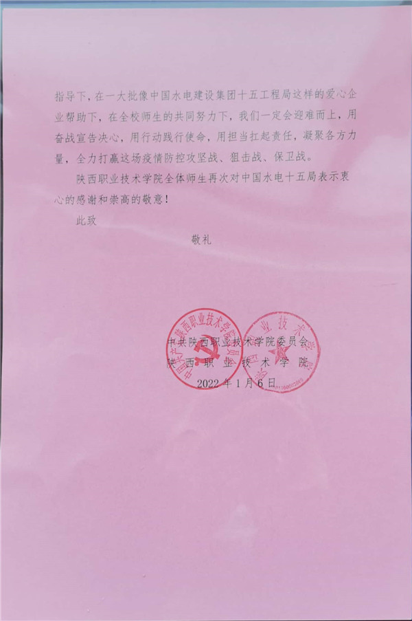 “感謝貴單位在關(guān)鍵時(shí)期雪中送炭,于危急關(guān)頭解囊相助……這是對(duì)陜西省教育系統(tǒng)、特別是陜西職業(yè)技術(shù)學(xué)院疫情防控工作的熱情支援和資助!”