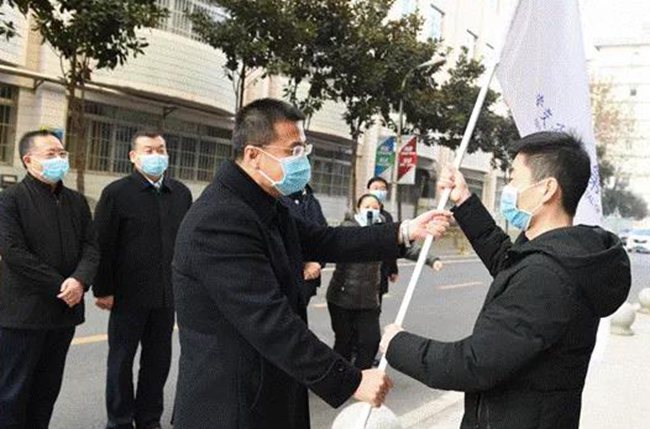 白曉旭從院黨委副書(shū)記馮廣林手里接過(guò)隊(duì)旗。西安交大第一附屬醫(yī)院供圖