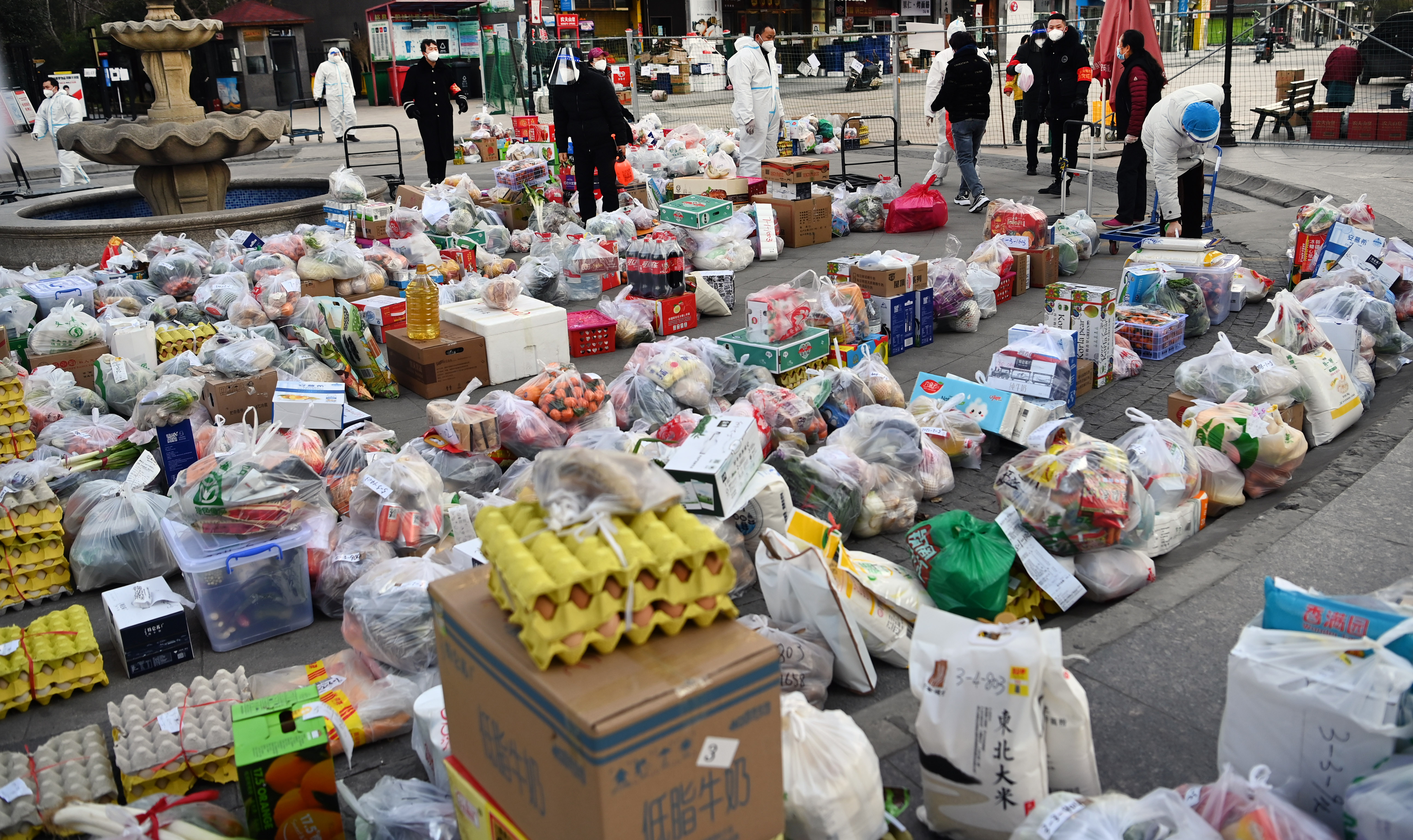 1月12日,下沉干部和志愿者在社區(qū)門前小廣場(chǎng)準(zhǔn)備配送生活物資。新華社記者 陶明 攝
