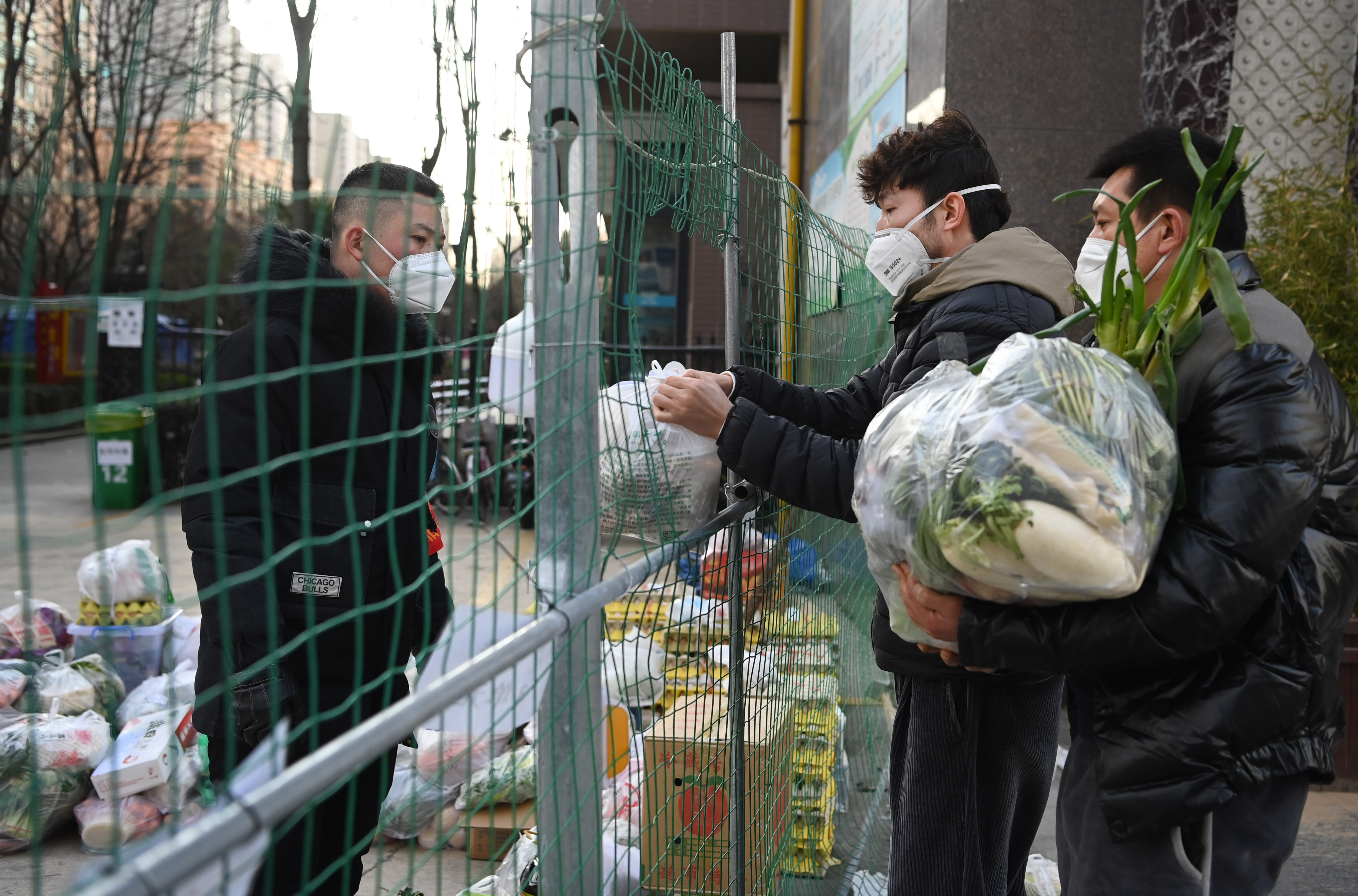 1月12日,志愿者(左)在社區(qū)門前小廣場(chǎng)接收居民線上購(gòu)買的生活物資。新華社記者 陶明 攝