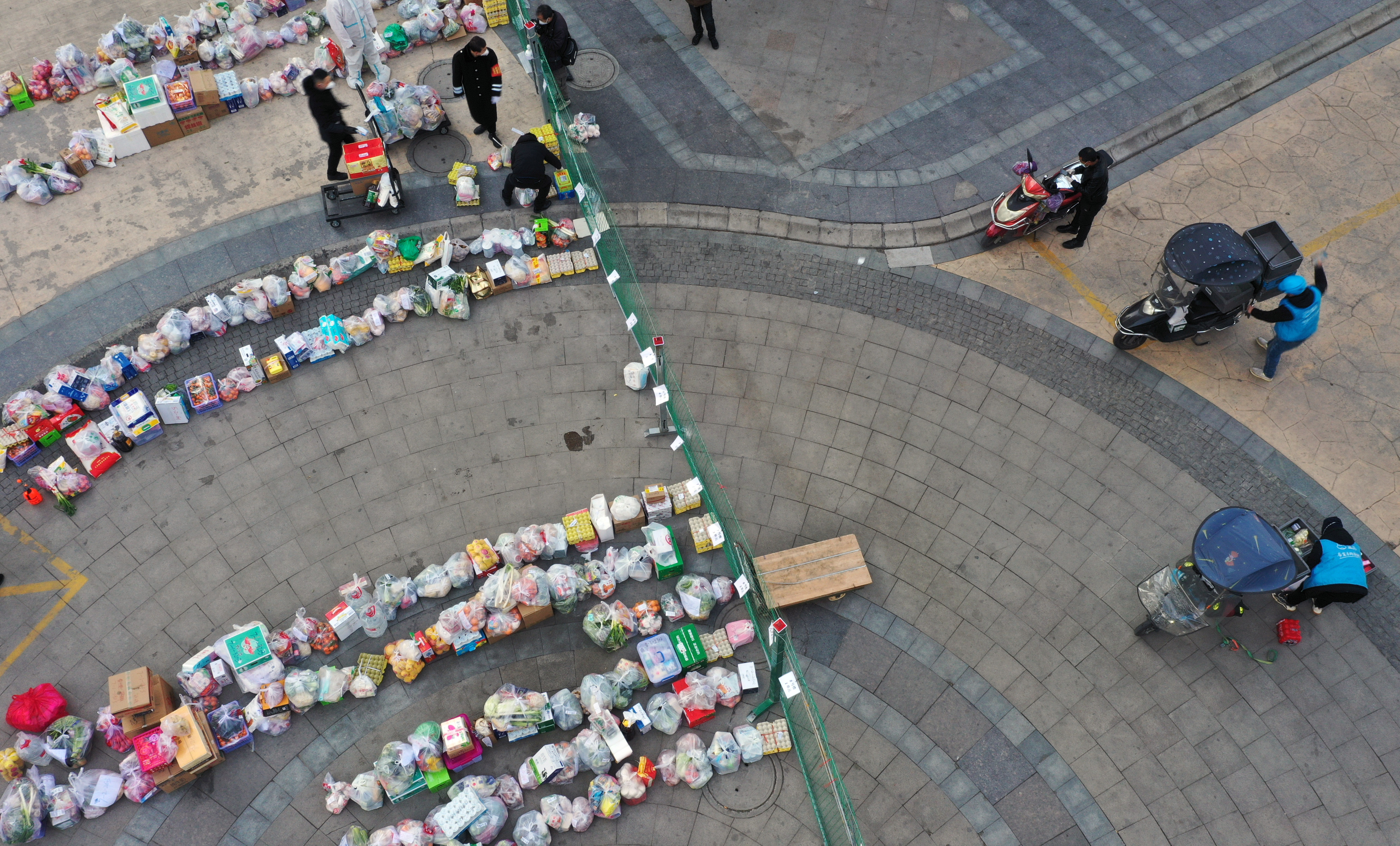 1月12日,下沉干部和志愿者在社區(qū)門前小廣場(chǎng)接收居民線上購(gòu)買的生活物資(無(wú)人機(jī)照片)。