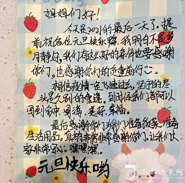 12月31日晚,即將迎來(lái)我國(guó)傳統(tǒng)佳節(jié)元旦。隔離學(xué)生怡忻悅通過(guò)手機(jī)向田甜發(fā)來(lái)了一張留言卡片,“姐姐好!今天是2021年的最后一天了,提前祝大家元旦快樂(lè)。我明白不是歲月靜好,我們有這么好的條件要感謝你們,感謝你們的負(fù)重前行。相信疫情一定飛速過(guò)去,堅(jiān)守的盡頭是久別的重逢,到時(shí)候我們都可以回到家中,圓滿(mǎn)、美好、幸福。最后感謝你們?yōu)槲覀儨?zhǔn)備飯菜,準(zhǔn)備生活用品,讓我們大家非常安心。”學(xué)生們一句句發(fā)自肺腑、情真意切的心里話在這數(shù)九寒天里溫暖和鼓舞著每一名后勤保障人員,讓大家的疲憊一掃而空,渾身充滿(mǎn)了干勁和戰(zhàn)勝疫情的巨大信心。