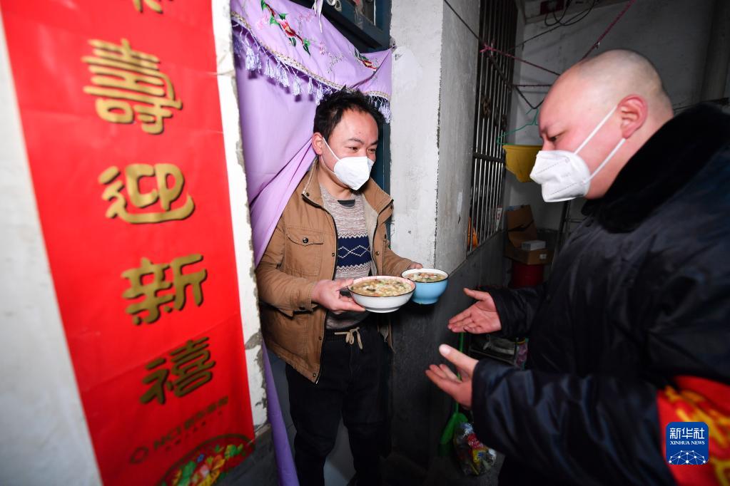 1月12日,三家村村民楊光(右)為租住在自家房屋的務(wù)工人員送上午餐。新華社記者 張博文 攝