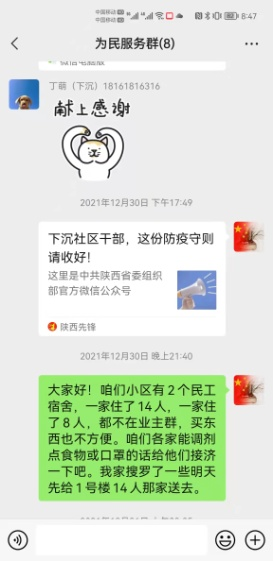 看著手里拎的幾顆白菜、蘿卜、西紅柿,我感到慚愧難當(dāng),作為一名黨員、一名下沉干部,實(shí)在是失職,沒有履行好“民之所憂,我必念之;民之所盼,我必行之”的使命擔(dān)當(dāng)。投送完愛心菜到家后,我立即在群里倡議小區(qū)下沉干部對(duì)1-3-2302的務(wù)工人員開展愛心救助活動(dòng),并從自家的抗疫儲(chǔ)備物資里勻出了2袋子蔬菜、豆腐乳、魚醬罐頭、口罩、水果等物資,并附上了溫馨小紙條,寫上我的聯(lián)系電話,鼓勵(lì)他們堅(jiān)定克服困難的信心和決心。第二天,社區(qū)領(lǐng)導(dǎo)、小區(qū)鄰居們得知情況后,紛紛伸出援助之手,不到半小時(shí),鍋灶有了、菜刀案板有了、糧食蔬菜也都有了…,社區(qū)的慰問品也送來了。大伙不僅給他們送去了物資,更送去了關(guān)心和安慰,他們的生活起居也迅速融入了小區(qū)大家庭,業(yè)主群里每天都有人對(duì)他們噓寒問暖,他們也經(jīng)常在業(yè)主群曬他們做的川味美食。他們私下跟我說,這幾年,他們?cè)诤?、新疆等地都遇到過疫情,但最讓他們感動(dòng)的還是西安,黨和政府的細(xì)致安排、西安人民的熱情相助,讓他們?cè)谒l(xiāng)異地孤立無援時(shí),第一次感到不慌了。