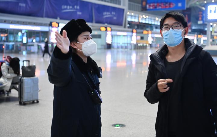 1月16日,西安北站客運員(左)在候車大廳引導(dǎo)旅客乘車。新華社記者 陶明 攝