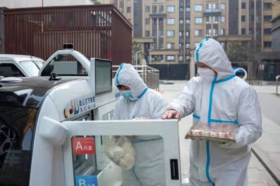 關(guān)好柜門后,白色小車便沿著設(shè)定軌道緩緩駛向附近的鳳鳴小區(qū)。穿著防護(hù)服的工作人員早已等候在指定位置,他們打開寫有樓棟號(hào)的柜門取出貨物,關(guān)上柜門后,小車又自動(dòng)駛向下一站……這種科技感十足的配送方式,既提高了效率,又實(shí)現(xiàn)了全程無接觸精準(zhǔn)配送。
