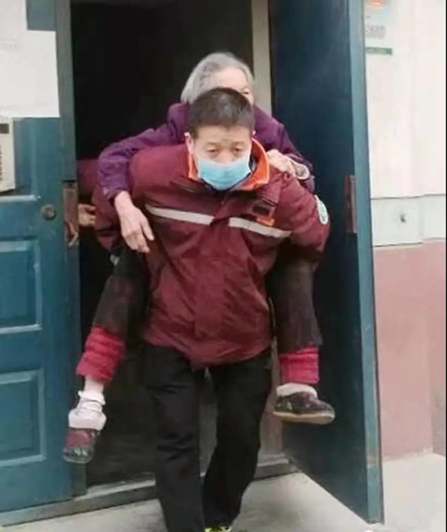 市內某小區(qū)一名獨居老人急需就醫(yī),120急救車到達后發(fā)現(xiàn)其居住單元老舊,擔架根本無法使用,情急之下,司機楊明背起老人快速將其轉入救護車。