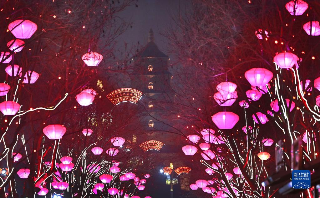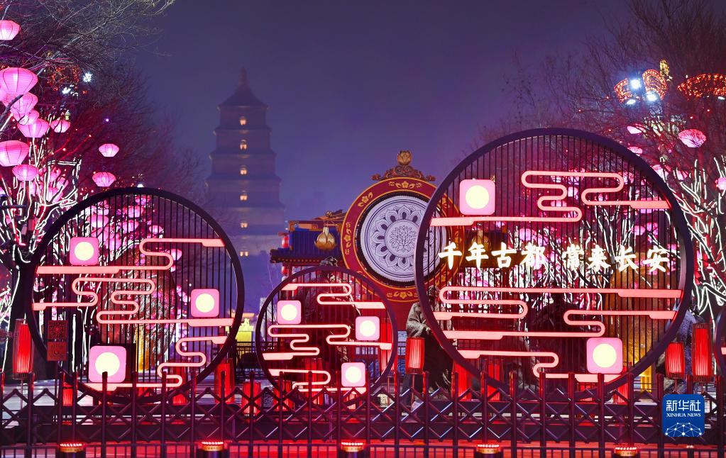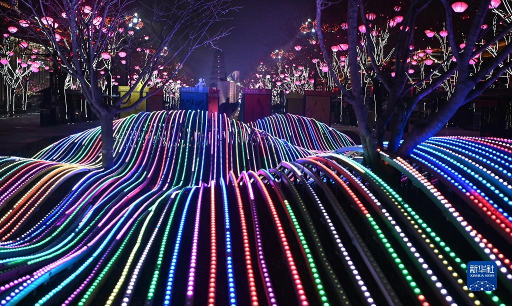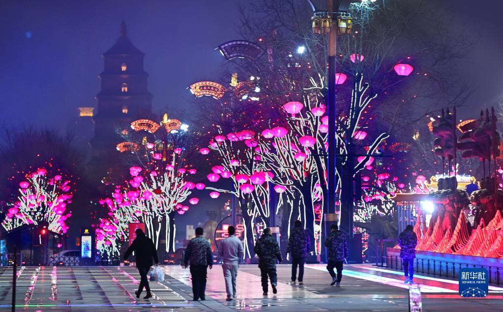春節(jié)臨近,西安市大唐不夜城點(diǎn)亮璀璨奪目的燈光,迎接新春佳節(jié)的到來(lái)?!?/p>