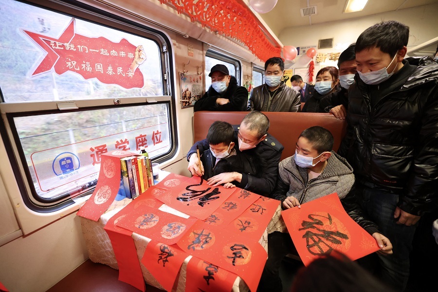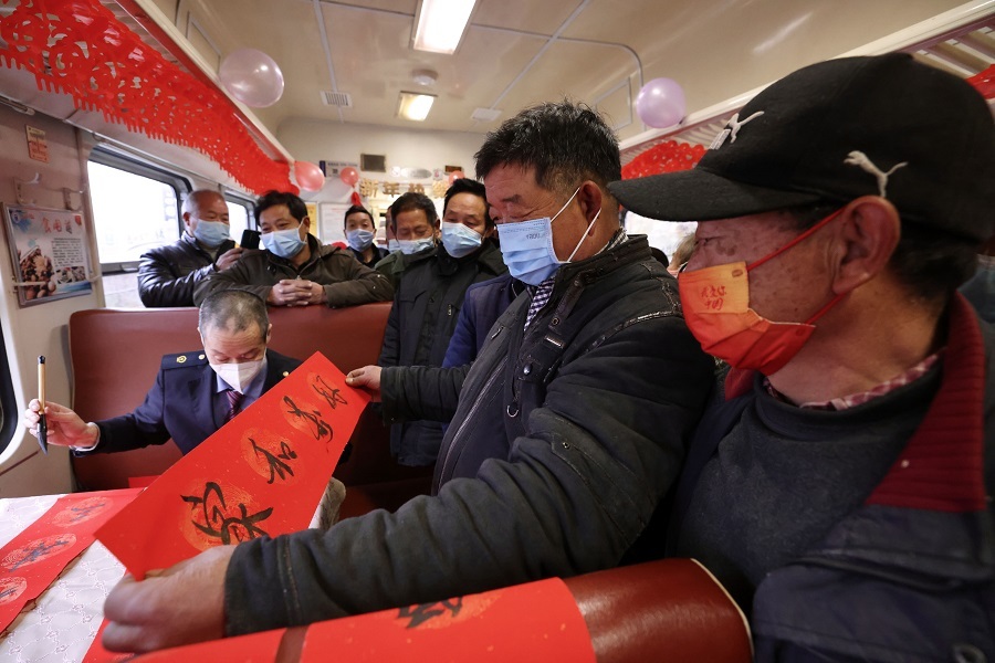 列車工作人員為旅客寫春聯(央廣網發(fā) 劉松霖攝)