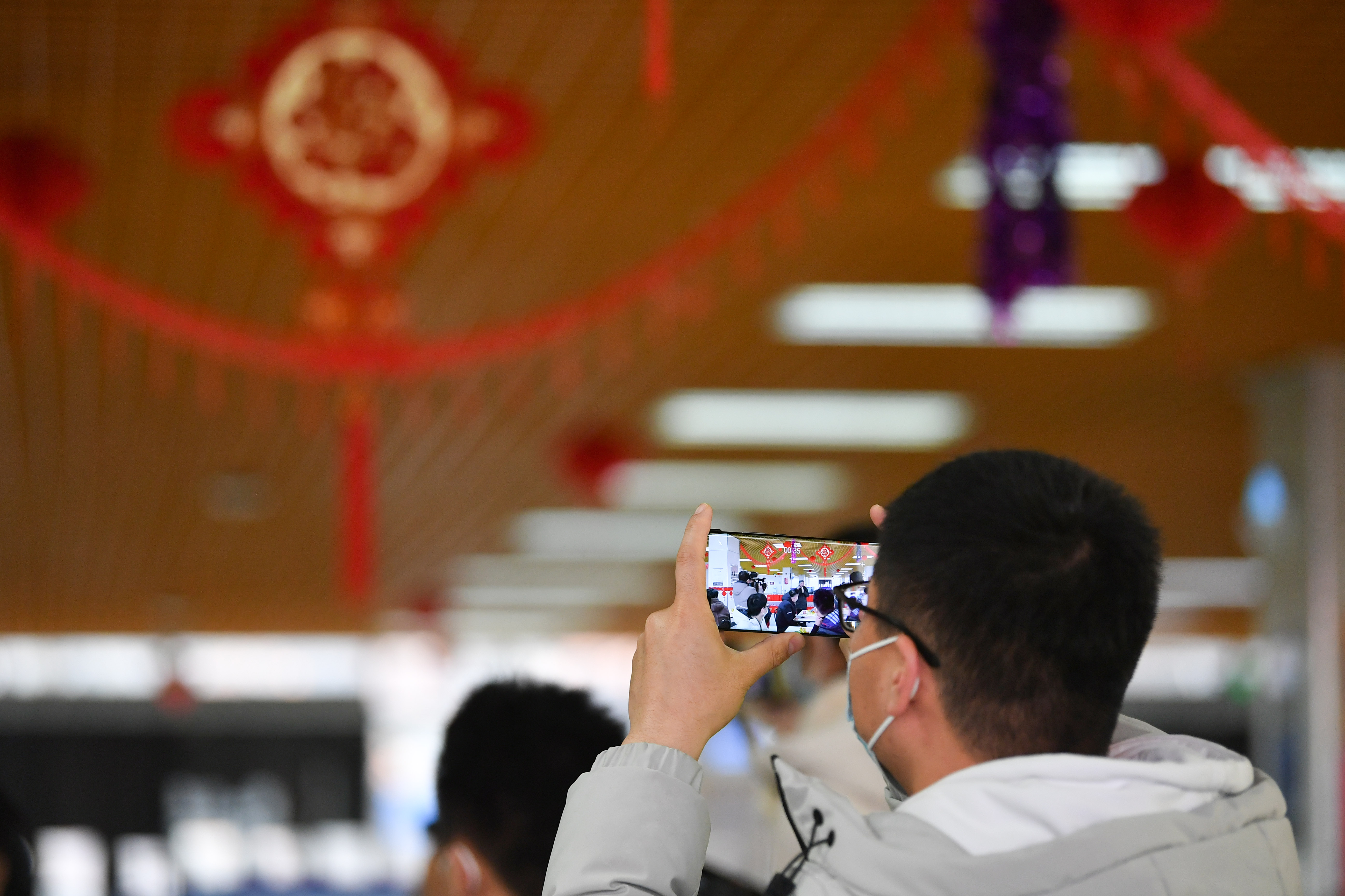 1月29日,西安交通大學(xué)興慶校區(qū),一名留校學(xué)生拍攝禮包發(fā)放現(xiàn)場(chǎng)。新華社記者 張博文 攝