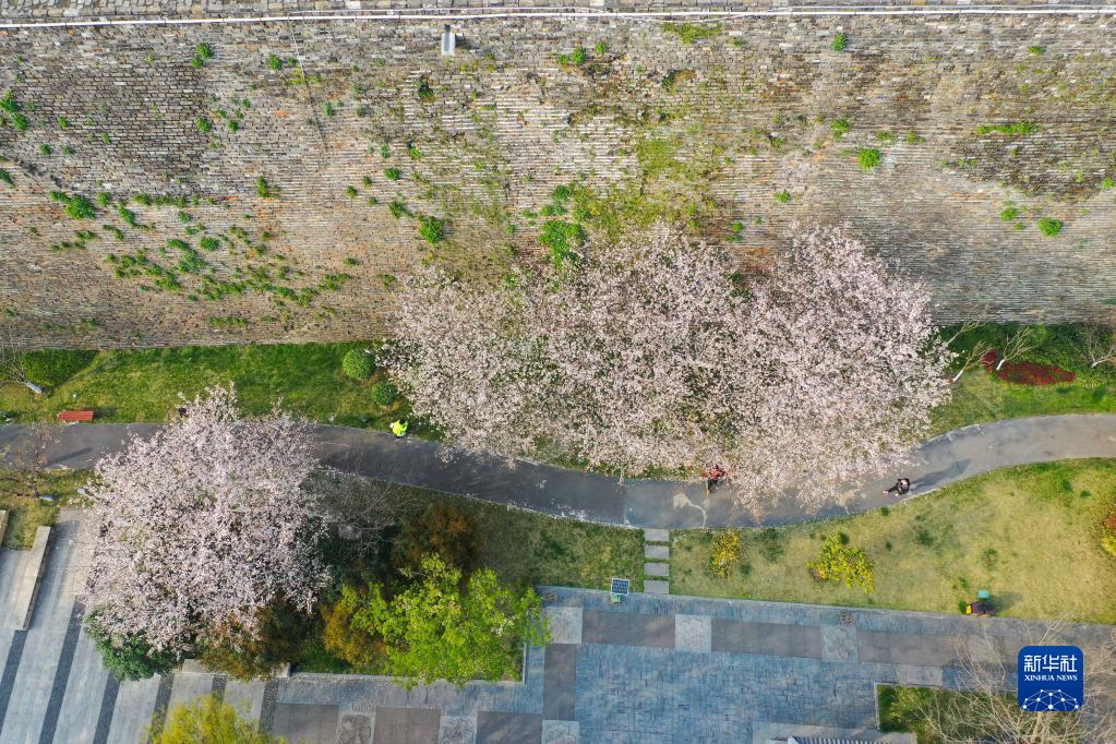 3月23日,游人在南京明城墻腳下游玩(無(wú)人機(jī)照片)。新華社記者 季春鵬 攝