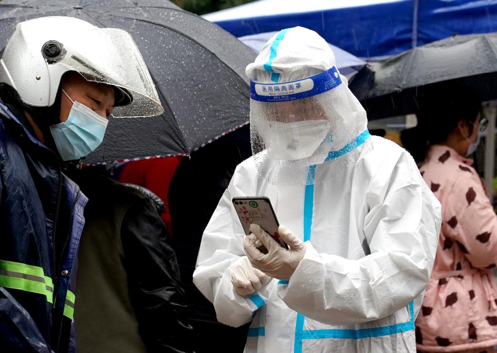3月13日,志愿者在深圳羅湖區(qū)東門廣場核酸檢測點引導(dǎo)居民。新華社發(fā)(儲焱攝)