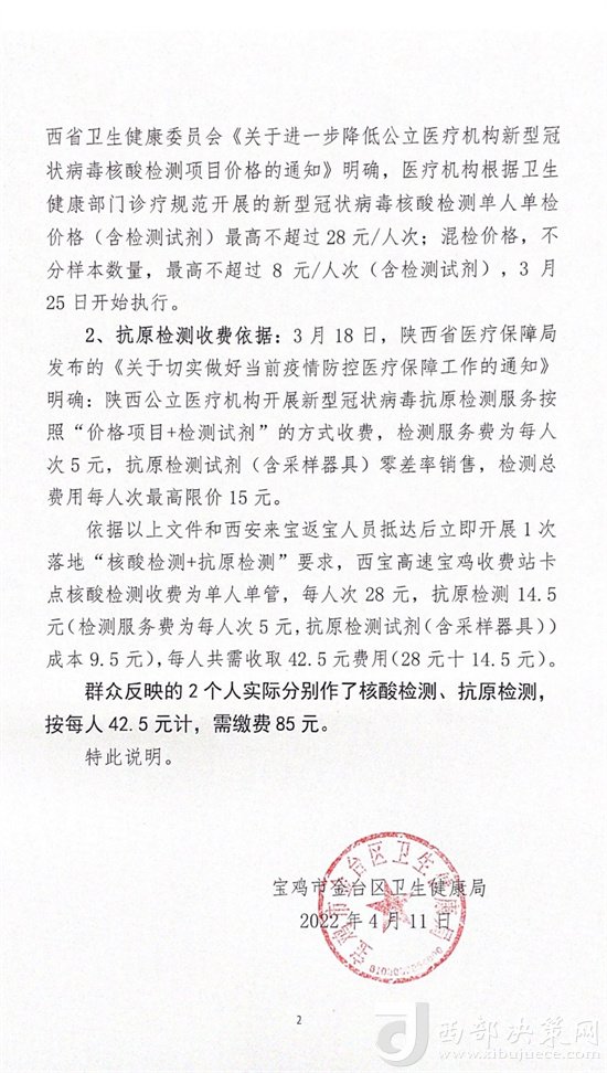 熱線回復(fù)|4月11日,寶雞市金臺區(qū)衛(wèi)生健康局就“群眾質(zhì)疑高速路口核酸檢測收費(fèi)過高問題”向西部決策網(wǎng)回復(fù)并進(jìn)行了情況說明。具體內(nèi)容如下: