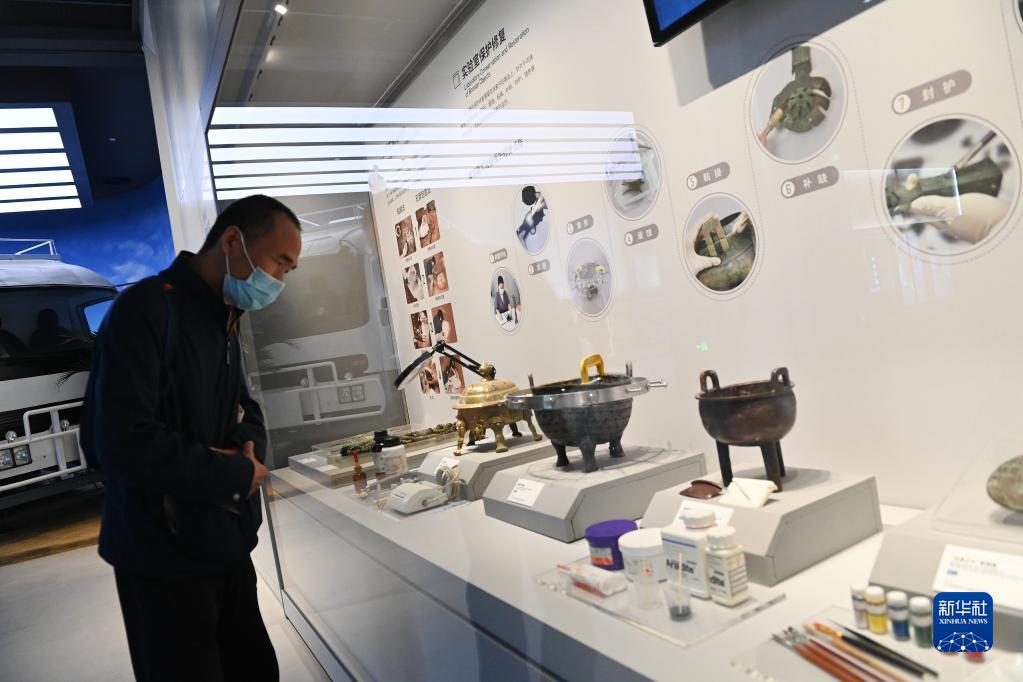 4月28日,游客在陜西考古博物館內(nèi)了解文物的實驗室保護修復。新華社記者 李一博 攝