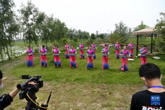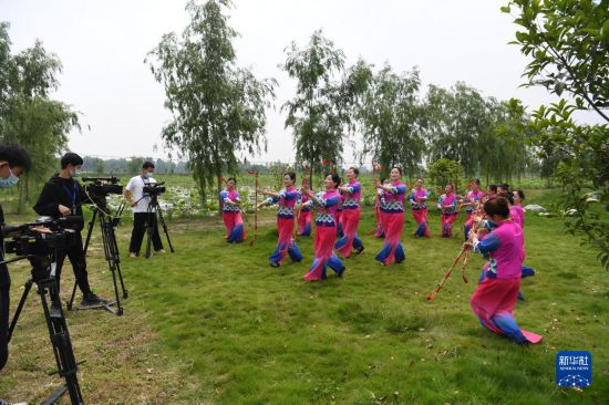 5月15日,肥西縣柿樹崗鄉(xiāng)村民通過“云上”直播表演當(dāng)?shù)貍鹘y(tǒng)非遺文化項(xiàng)目蓮湘舞。新華社記者劉軍喜攝
