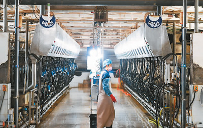 近年來,內(nèi)蒙古自治區(qū)巴彥淖爾市臨河區(qū)干召?gòu)R鎮(zhèn)依托當(dāng)?shù)貎?yōu)勢(shì)大力發(fā)展養(yǎng)牛產(chǎn)業(yè),采取“支部+合作社+基地+農(nóng)戶”的發(fā)展模式,帶動(dòng)農(nóng)戶發(fā)展養(yǎng)牛產(chǎn)業(yè),促進(jìn)農(nóng)戶增收致富,助力鄉(xiāng)村振興。圖為1月19日,巴彥淖爾市臨河區(qū)東鑫奶牛養(yǎng)殖專業(yè)合作社擠奶車間。貝 赫攝(新華社發(fā))