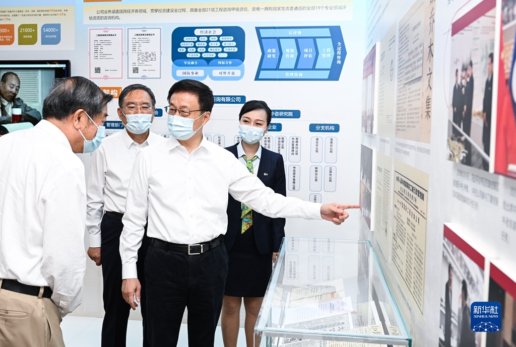 會(huì)前,韓正前往展廳,聽取中國國際工程咨詢有限公司的發(fā)展歷程介紹,了解公司承擔(dān)基礎(chǔ)設(shè)施、重大工程等重點(diǎn)領(lǐng)域咨詢?nèi)蝿?wù)以及高端智庫建設(shè)等情況。