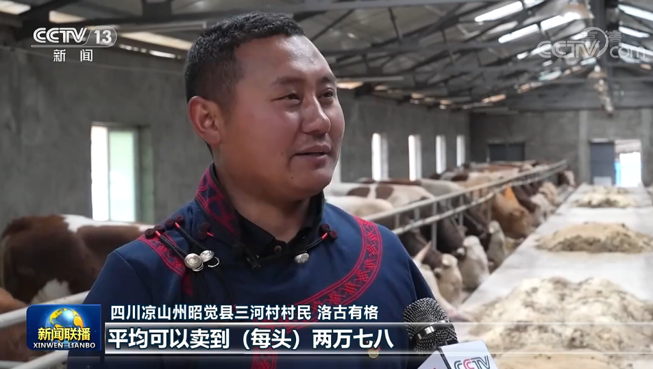 四川涼山州昭覺(jué)縣三河村村民 洛古有格:當(dāng)時(shí)總書記來(lái)的時(shí)候,我們這個(gè)養(yǎng)牛只有十幾頭。通過(guò)發(fā)展,我們?nèi)哟逵辛?000多頭這個(gè)西門塔爾?!,F(xiàn)在我們這個(gè)牛,平均可以賣到(每頭)兩萬(wàn)七八,大的可以賣到三萬(wàn)多元,效益特別好。