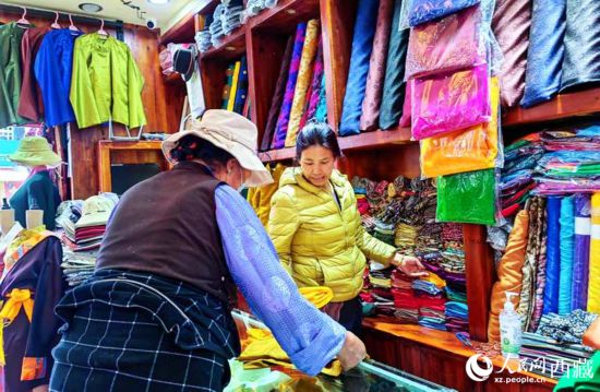 進(jìn)入旅游旺季后,來(lái)自天南地北的游客到拉薩八廓古城賞民俗品文化,位于八廓街上的朵究倉(cāng)藏裝店也因此成了必備網(wǎng)紅打卡店。“我在新聞里看到總書(shū)記來(lái)過(guò)你們店,所以專(zhuān)門(mén)過(guò)來(lái)的,想買(mǎi)一身藏裝作紀(jì)念,老板你幫我看看哪件合適?”來(lái)自東北的吳女士邊挑選衣服邊說(shuō)。