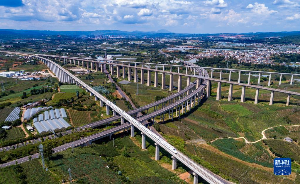 8月23日,綜合檢測車在彌蒙高鐵彌勒站附近上行線行駛,遠(yuǎn)處是下行線,中間橫向鐵路是南寧至昆明客運(yùn)專線,下穿高速是瀘彌高速(無人機(jī)照片)。新華社記者 陳欣波 攝